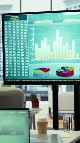 Vertical In a professional boardroom, computer screen showcases business data and statistics, aiding executives in strategy planning. Empty office space for meeting to help with workflow optimization. Pro Video