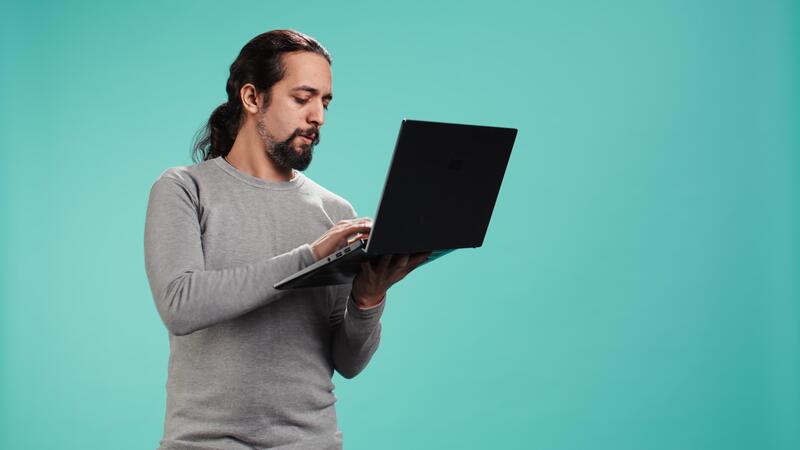 Man composing email, typing on laptop keyboard, excited to log off after work. Cheerful person sending mail online, brainstorming message idea, isolated over studio background, camera B Pro Video