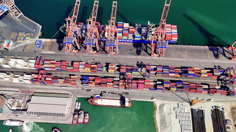 Cranes loading and unloading cargo create a lively scene at a bustling port, highlighting dockworkers as they maneuver containers under bright, sunny skies Pro Video