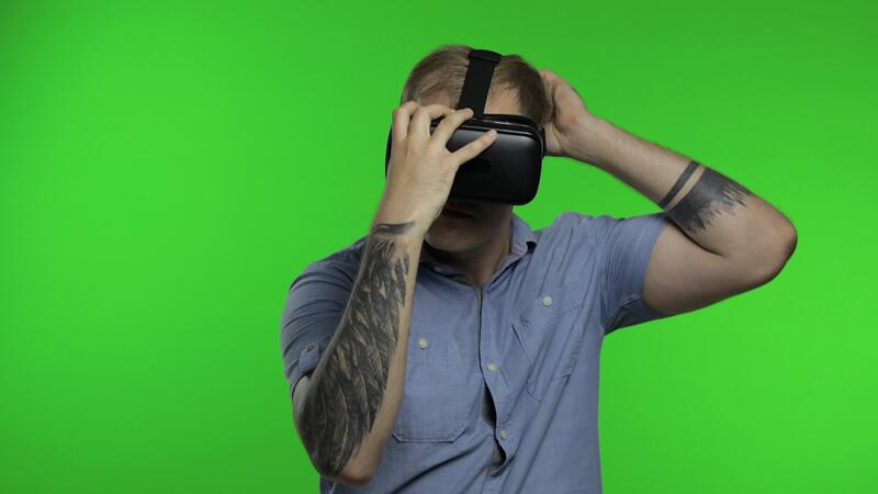 Man using VR app helmet to play simulation game, drawing. Guy watching virtual reality 3d Pro Video
