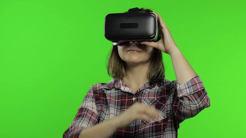 Girl using VR app helmet to play simulation game. Slide gestures. Watching virtual reality 3d Pro Video