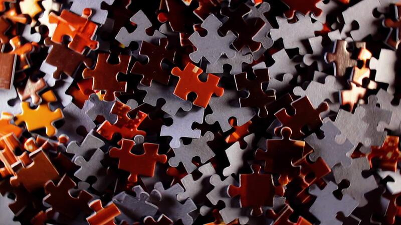 Background of Colored Puzzle Pieces that Rotating Clockwise - Top View. Texture of Incomplete Red and Grey Jigsaw Puzzle with Low Key Light - Right Rotation Pro Video