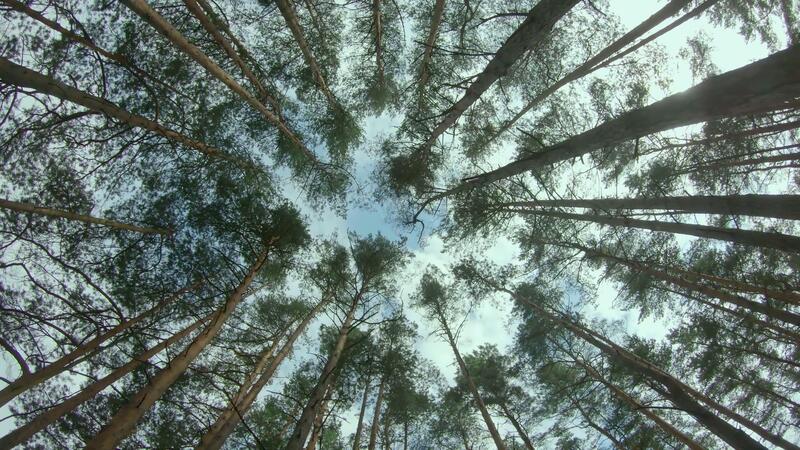 Low Angle View of a Pine Forest when Looking Up to the Trees. Bottom View of Pine Crowns at Sunny Summer Day. The Sky Can Be Seen Through the Tops of the Trees. Forward Gimbal Stabilizer Movement Pro Video
