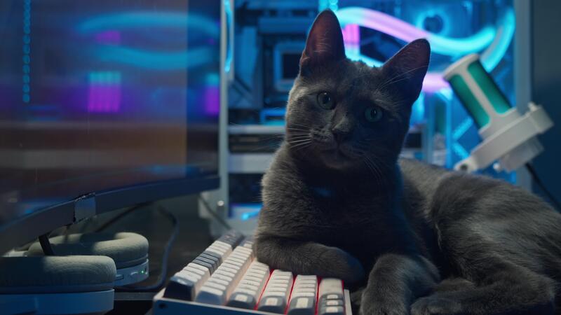 A charming little gray kitten is nestled on the keyboard of the computer, observing the screen in the glow of neon light. Pro Video