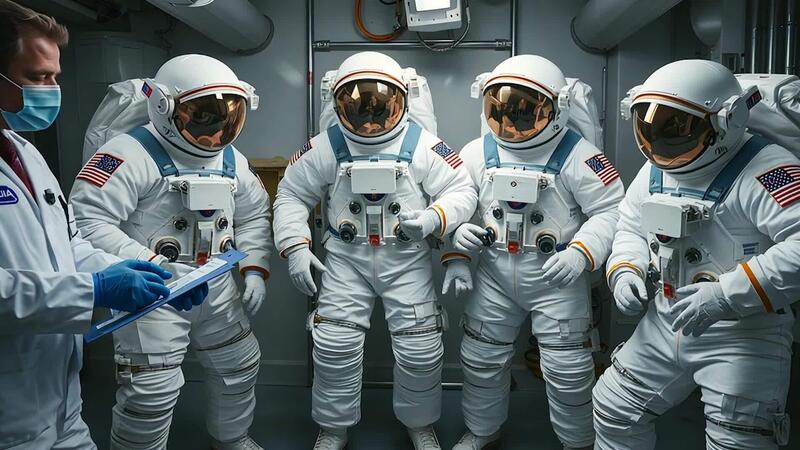 Animation of a team of astronauts in spacesuits and a maneuvering unit conducting a space mission in orbit, showcasing advanced space technology and zero-gravity exploration. Pro Video