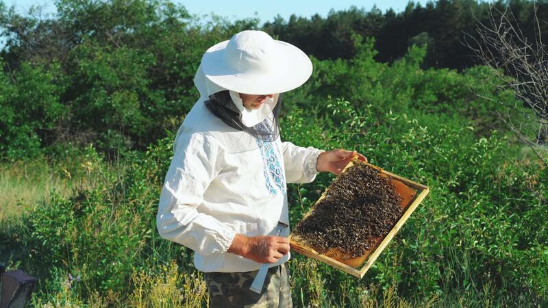 Beekeeper is working with bees and beehives on the apiary. Frames of a bee hive. Free Video