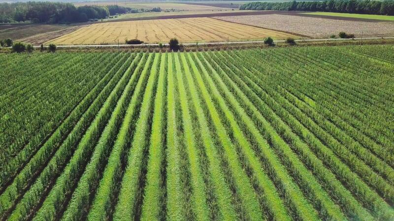 rows of apple trees are growing in a large area in the field in the summer for processing in the production of juices. Aerial view Pro Video