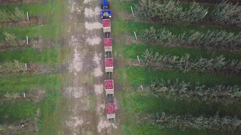 a tractor with trailers from apples is riding along the road with an apple orchard on two sides in the summer in the field. Pro Video