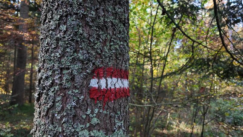 Tree trunk with red and white trail marking in autumn forest, ideal for hiking concepts Pro Video