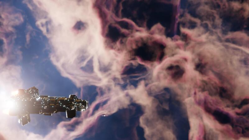 Deep Space Exploration concept. Side view Spaceship flying through nebula or galaxy clouds. Seamles loop, 3d render. Pro Video