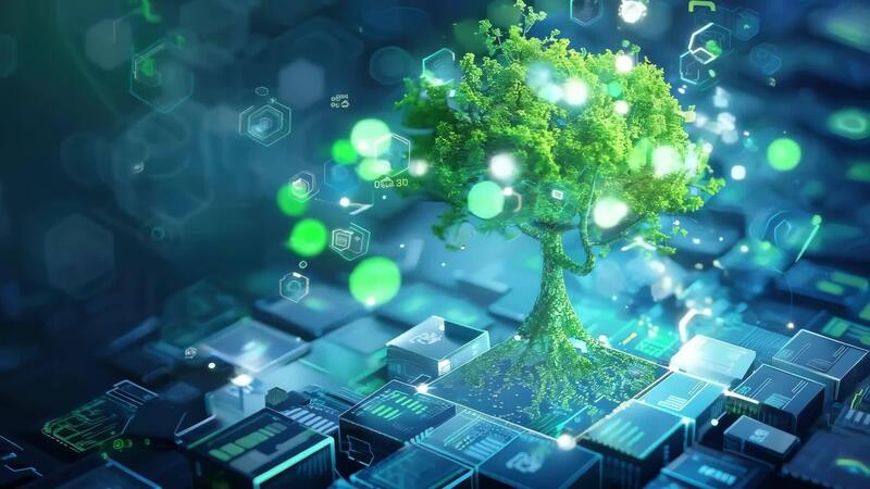 A vibrant tree emerges from a circuit board, symbolizing the fusion of nature and technology in a digital world. Free Video