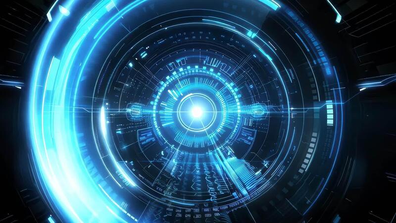 Futuristic digital interface with bright blue light and glowing patterns, representing advanced technology and innovation. Free Video