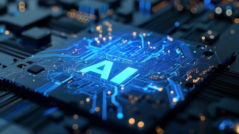 Close-up of a circuit board with glowing AI letters, symbolizing advanced technology and artificial intelligence innovation. Free Video