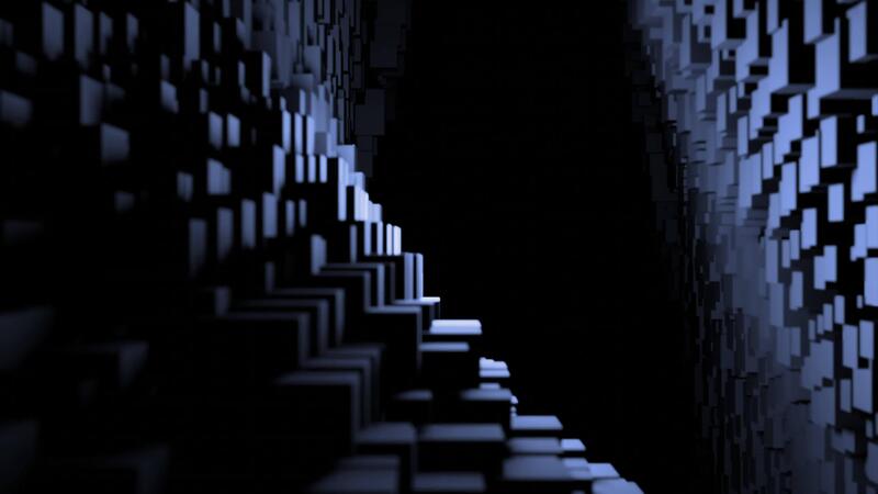 Abstract flight inside dark purple tunnel of many cubes and rectangles. Design. Endless corridor with 3D effect. Pro Video