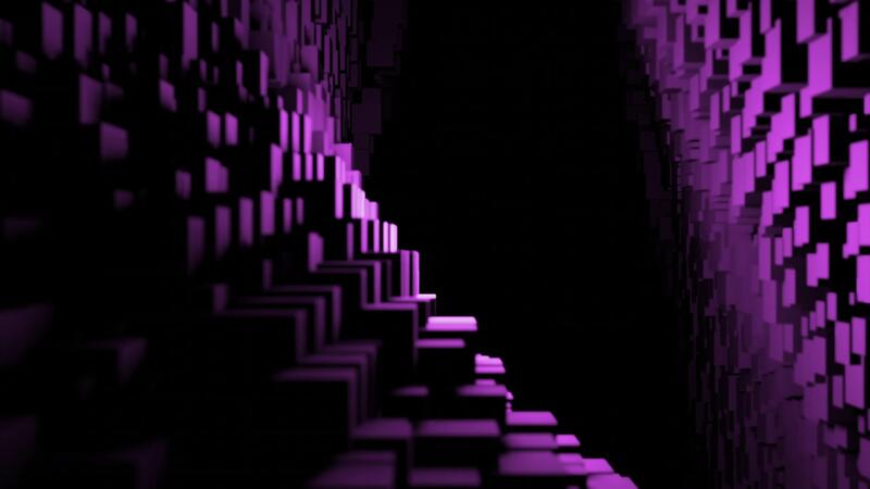 Abstract flight inside dark purple tunnel of many cubes and rectangles. Design. Endless corridor with 3D effect. Pro Video