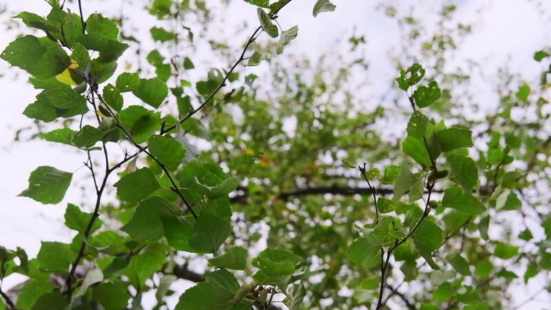 Bottom view of green leaves of branches swaying in wind. Clip. Branches with green leaves of tree in wind. Swaying branches with leaves in wind on cloudy summer day Pro Video