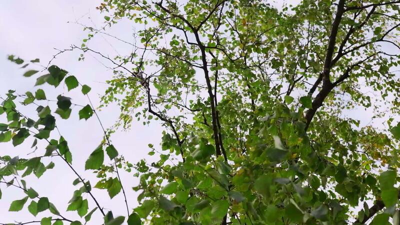 Bottom view of green leaves of branches swaying in wind. Clip. Branches with green leaves of tree in wind. Swaying branches with leaves in wind on cloudy summer day Pro Video