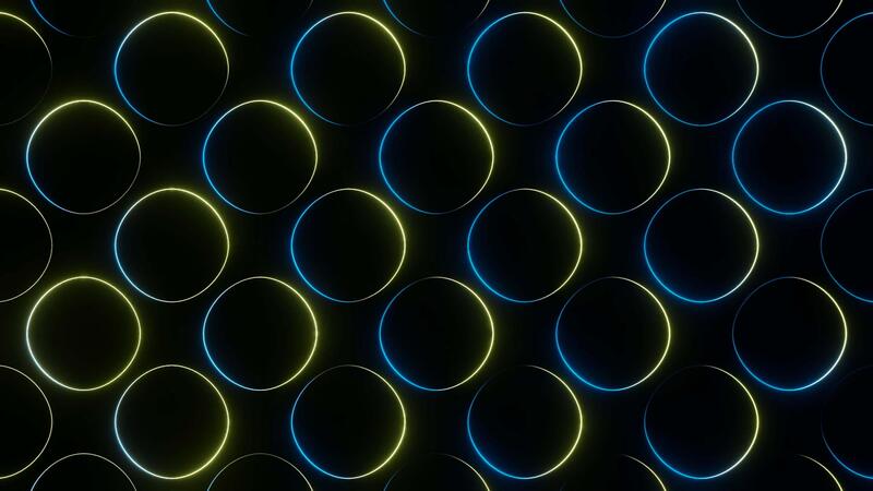 Background of shimmering neon rings on black background. Design. 3D volume effect with moving glitter of colorful rings. Colorful rings shimmer and create illusion of volume on black background Pro Video