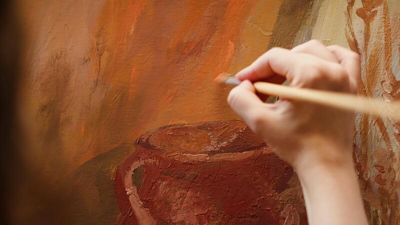 Female painter working on a canvas to create an artwork in studio, using bristles to apply dye with precision. Presenting her skill to create unique painting for the art gallery. Camera A. Pro Video