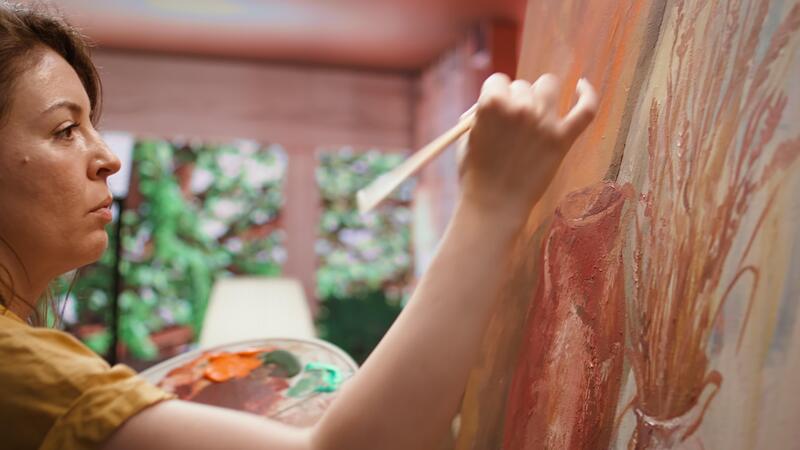 Female painter working on a canvas to create an artwork in studio, using bristles to apply dye with precision. Presenting her skill to create unique painting for the art gallery. Camera B. Pro Video
