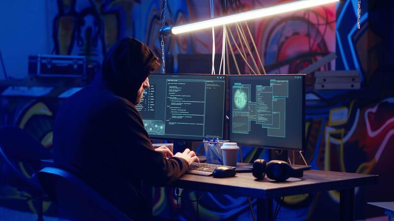 Hacker uses PC to target vulnerable unpatched connections, seeking to compromise digital devices and steal valuable sensitive data. Rogue programmer finds exploits for system vulnerabilities, camera B Pro Video