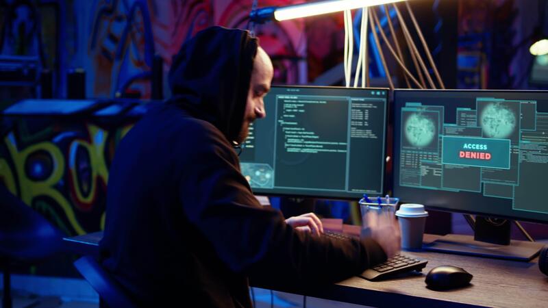 Hacker in dark underground warehouse trying to steal valuable data by targeting governmental websites but getting access denied error message, having cyber attacks rejected, dolly in close up shot Pro Video