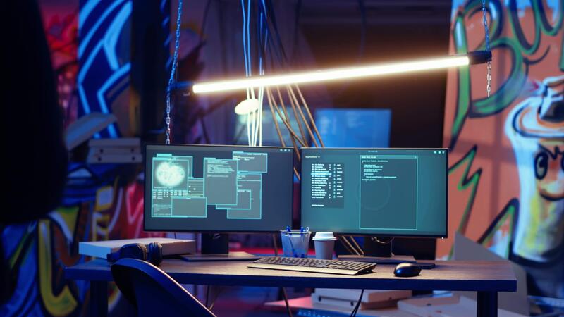 Hacker arriving with tablet in hidden base, deploying viruses on unaware victims computers, stealing sensitive and private information, selling it on darknet black market to highest bidder, camera B Pro Video