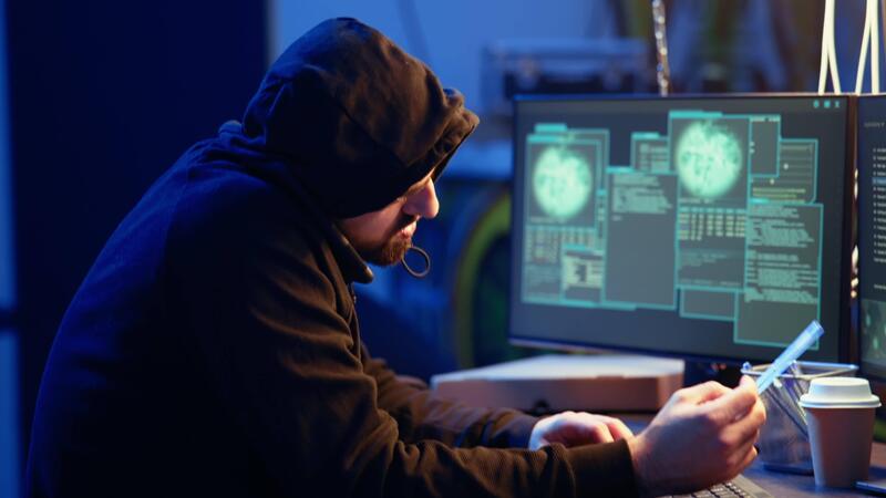 Hacker in abandoned warehouse talking on phone with partner, stealing data after using phishing technique. Man in telephone call with colleague, tricking users into revealing information, camera A Pro Video