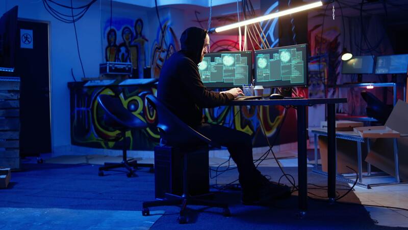 Hacker in hidden base successfully getting past anti tamper measures implemented by companies to protect products. Cracker pirating software and game releases, camera A handheld camera shot Pro Video