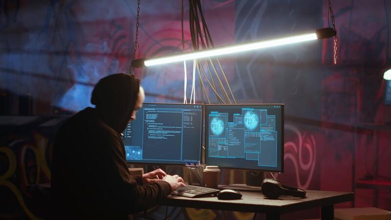Hacker arrives in messy base of operations with neon lights and graffiti drawings sprayed on walls. Cybercriminal using ghetto hideout as HQ to commit illegal activities using computer, camera B Pro Video