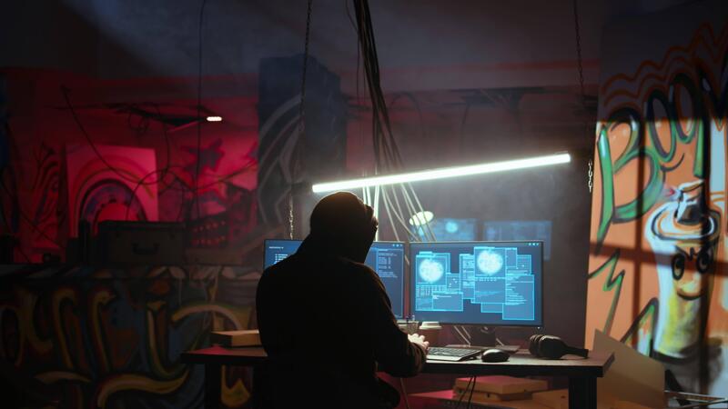 Hacker in hidden location with graffiti walls using PC to deploy malware on unsecured devices, stealing sensitive data from unaware users online and selling it on black market, jib down shot Pro Video
