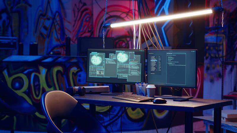 Zoom in shot of abandoned basement with graffiti drawings on walls and advanced technology computers left open running code. Underground hideout painted in grungy style used by hackers Pro Video