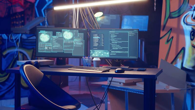 High tech computer system running malicious code in empty basement, handheld camera shot. PC monitors in empty neon lit criminal hideout used by hackers to commit illegal activities, camera B Pro Video