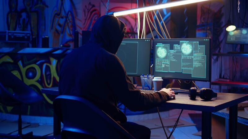 Evil cybercriminal in hidden base targeting vulnerable unpatched connections, getting past computer defenses and stealing data, dolly in shot. Hacker destroying firewalls and infecting computers Pro Video