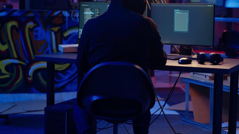 Close up of hacker in graffiti hideout focused on developing spyware software, using it to gather information from users computers without their knowledge, typing on keyboard, writing code, camera B Pro Video