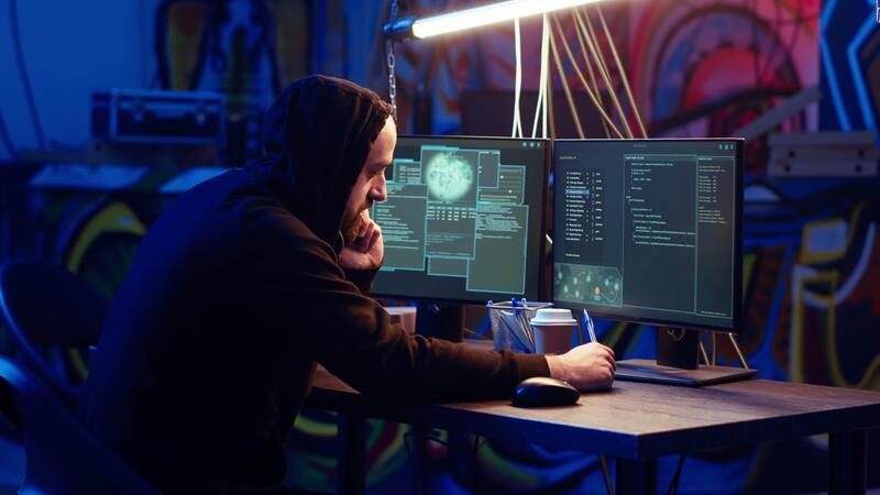 Malicious man hacking and talking on phone with partner, stealing credit card numbers, manipulating banking systems. Evil hacker runs dangerous code, chatting with friend in telephone call, camera B Pro Video