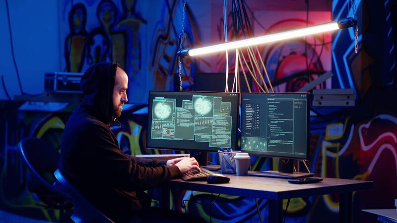 Skilled hacker deploying malware on unaware victims computers, stealing sensitive and private information, selling on darknet to highest bidder, looking at computer screen in hideout, camera B Pro Video