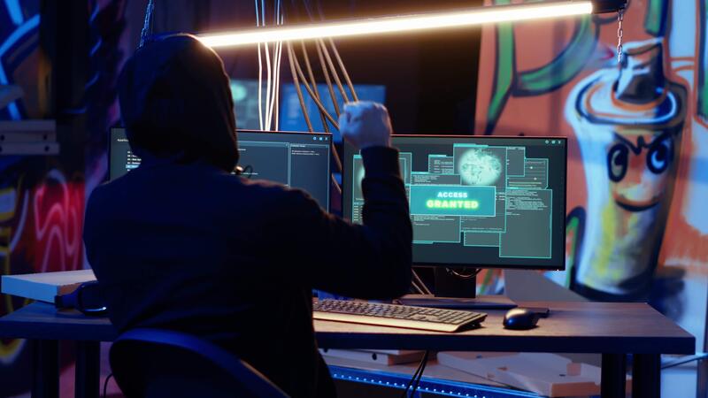Hacker in hidden shelter excited after managing to launch successful DDoS attack on website, celebrating, crashing it by sending large amounts of traffic from multiple sources, camera B close up Pro Video