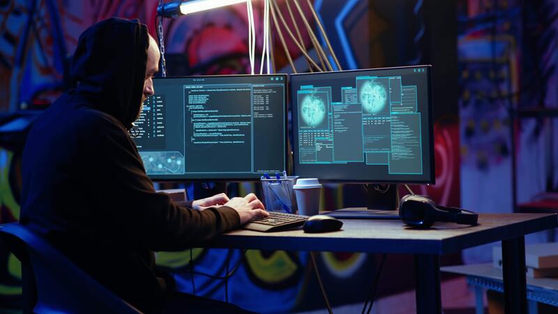 Hooded hacker in graffiti painted hideaway targeting vulnerable unpatched connections, having burst of joy after getting access granted past security and stealing valuable sensitive data Pro Video