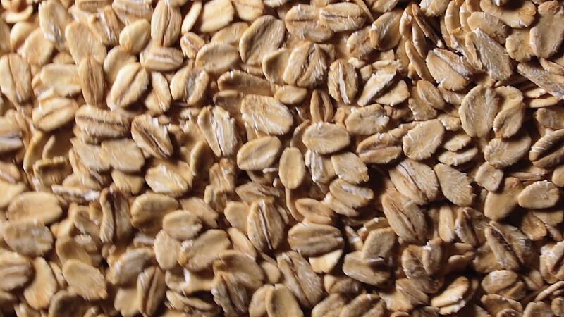 Oat Flakes Background Slowly Rotating Counter-Clockwise - Top View, Low Key Light. Scattered Dry Oat Flakes. Healthy Breakfast and Diet Eating Ingredients - Angular Rotation Left Pro Video