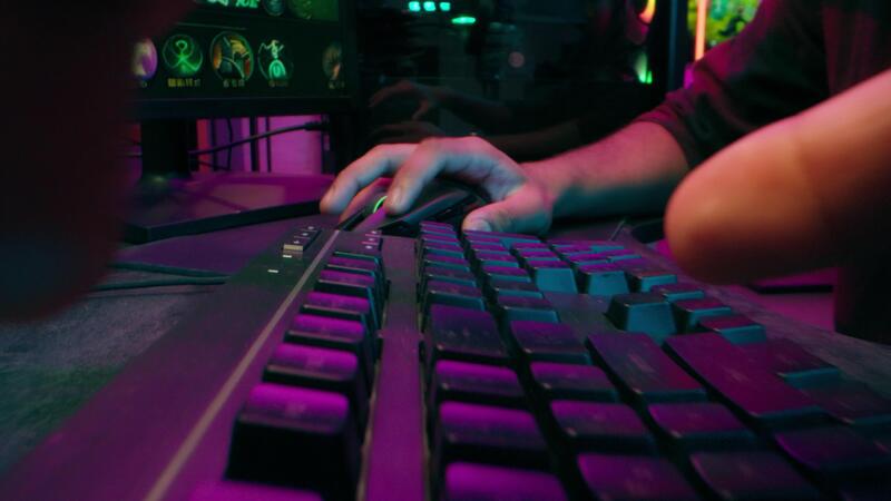 Close up hands man unrecognizable male typing gamer streamer hacker programmer desktop computer code data keyboard work cyber sport addiction play game neon light studio pc mouse networks guy Pro Video