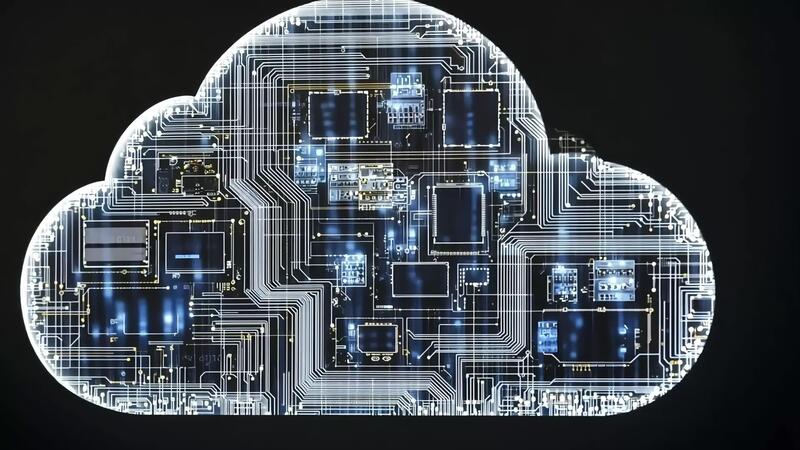 Close up of a circuit board with bright glowing wires and components in the shape of a cloud on a black background. Pro Video
