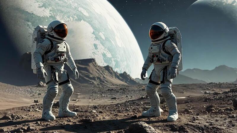 Two astronauts in advanced space suits stand on the rocky terrain of an unknown planet, set against a backdrop of a distant world, showcasing the marvels of space travel and planetary exploration. Free Video