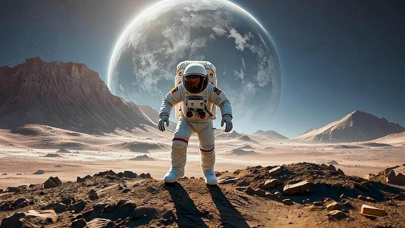 A lone astronaut on an alien planet, with a large planet looming in the sky. This image showcases space exploration, interplanetary travel, and the fascination with discovering worlds beyond Earth. Free Video