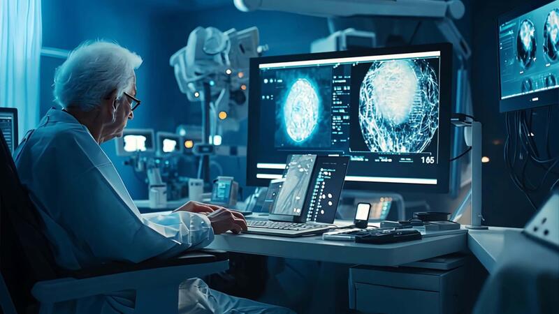 Elderly Scientist Analyzing Brain Scans in a Futuristic Medical Lab, Capturing the Cutting-Edge World of Healthcare Technology, Diagnostics, and Advanced Neuroscience. Pro Video