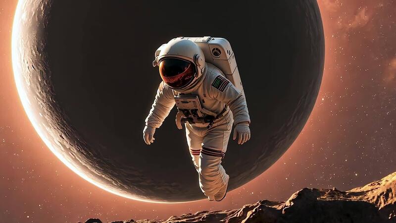 A lone astronaut drifts through space with a large planet in the background, representing the vastness of the universe and the quest for discovery. This image conveys exploration Pro Video