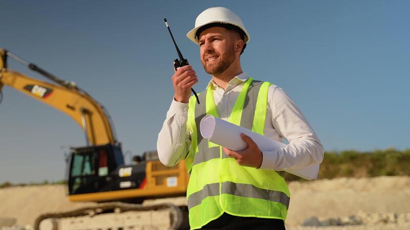 Engineer giving commands to employee in drilling machine using walkie talkie at quarry Pro Video