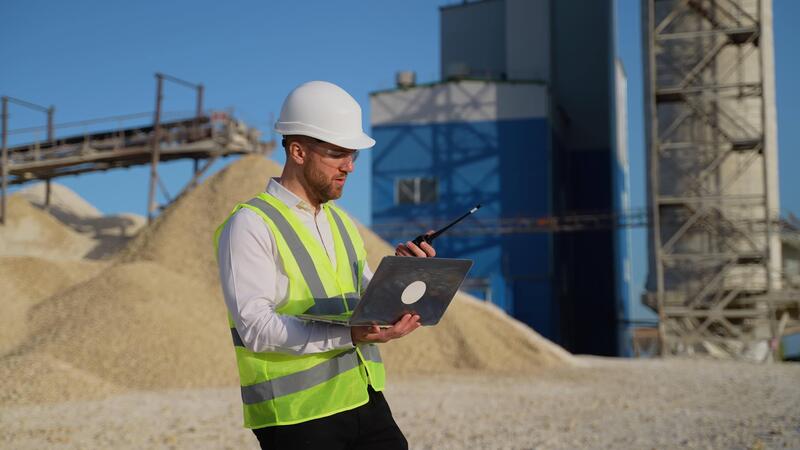 Foreman with laptop instructing workers using walkie talkie radio set at quarry Pro Video