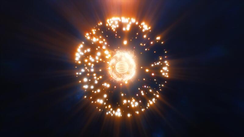 Glowing yellow sphere of light particles on a dark background, symbolizing energy and technology with a dynamic and futuristic feel Pro Video