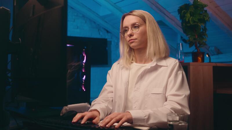 Caucasian businesswoman female girl satisfied happy business woman crypto trader coder IT programmer computer hacker student finish complete online work night late home office stretch hands relax rest Pro Video